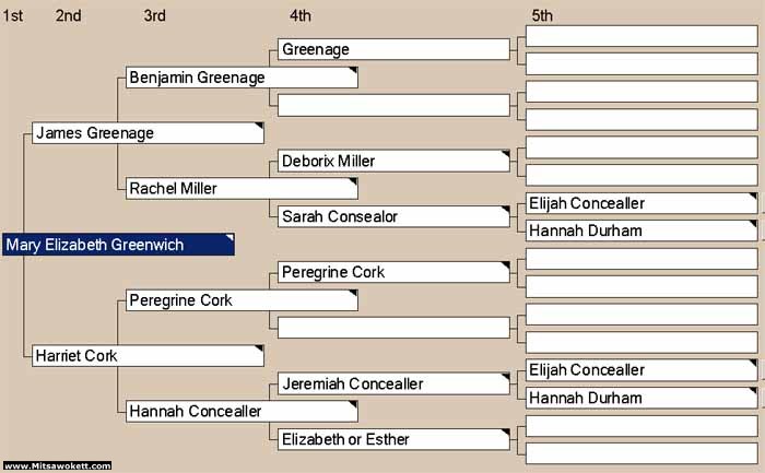 Ancestry of daughter Mary Elizabeth Greenwich or Grinage Theberge
